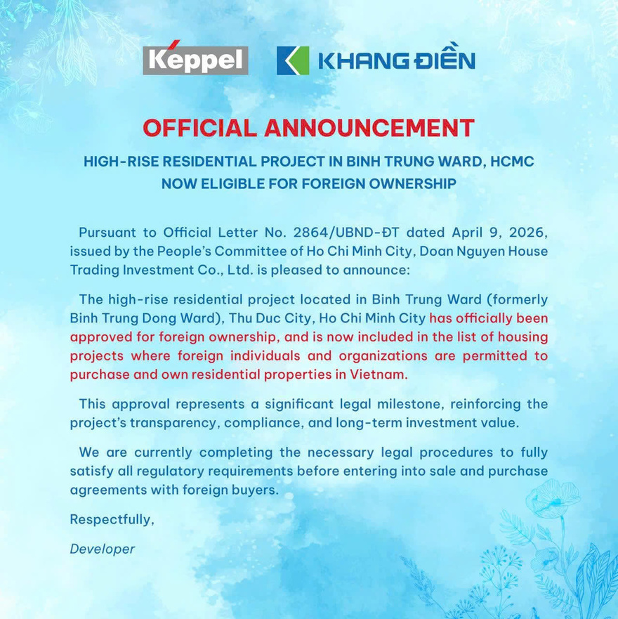 Khu nhà ở cao tầng do Công ty TNHH Đầu Tư Kinh Doanh Nhà Đoàn Nguyên làm Chủ đầu tư đã chính thức được đưa vào danh mục dự án mà tổ chức, cá nhân nước ngoài được phép sở hữu nhà ở.